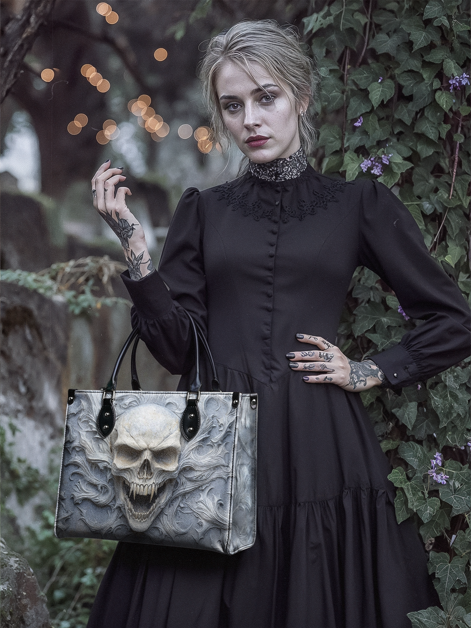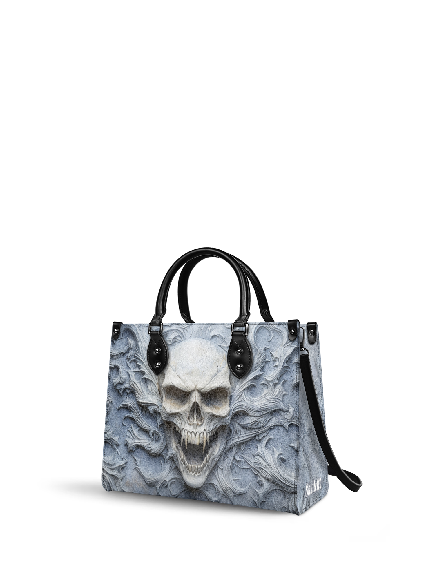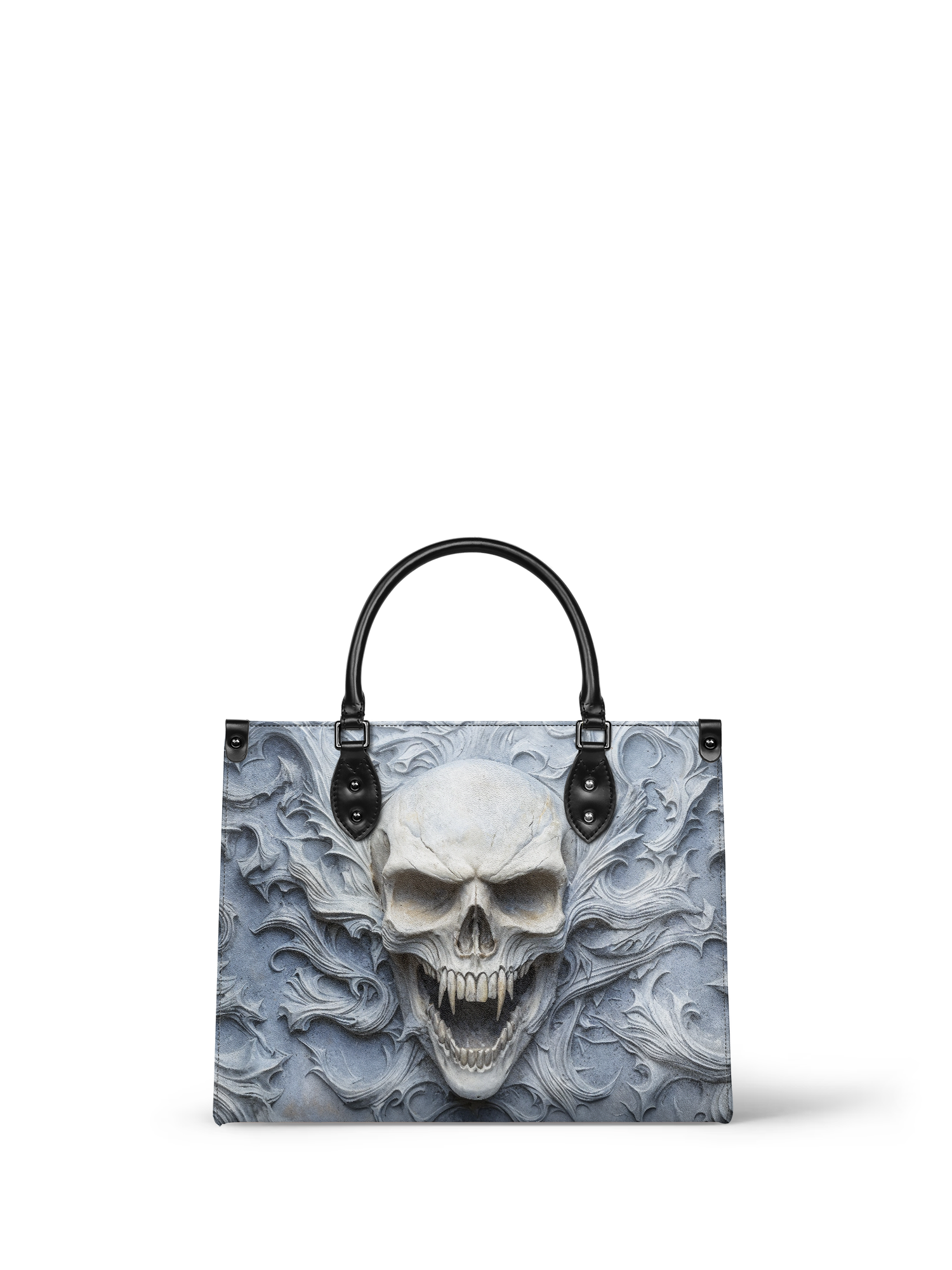 The Wraithbone leather handbag is where Gothic horror meets high fashion. Sculpted in icy tones of bone-white and steel-gray, the design features a snarling skull that seems to emerge from swirling stonework—like a cursed relic come to life. Crafted from durable vegan leather with sleek black handles and antique gold hardware, this handbag is made for those who wear darkness like armor. It’s not just a bag—it’s a bold declaration for those unafraid to bare their fangs.