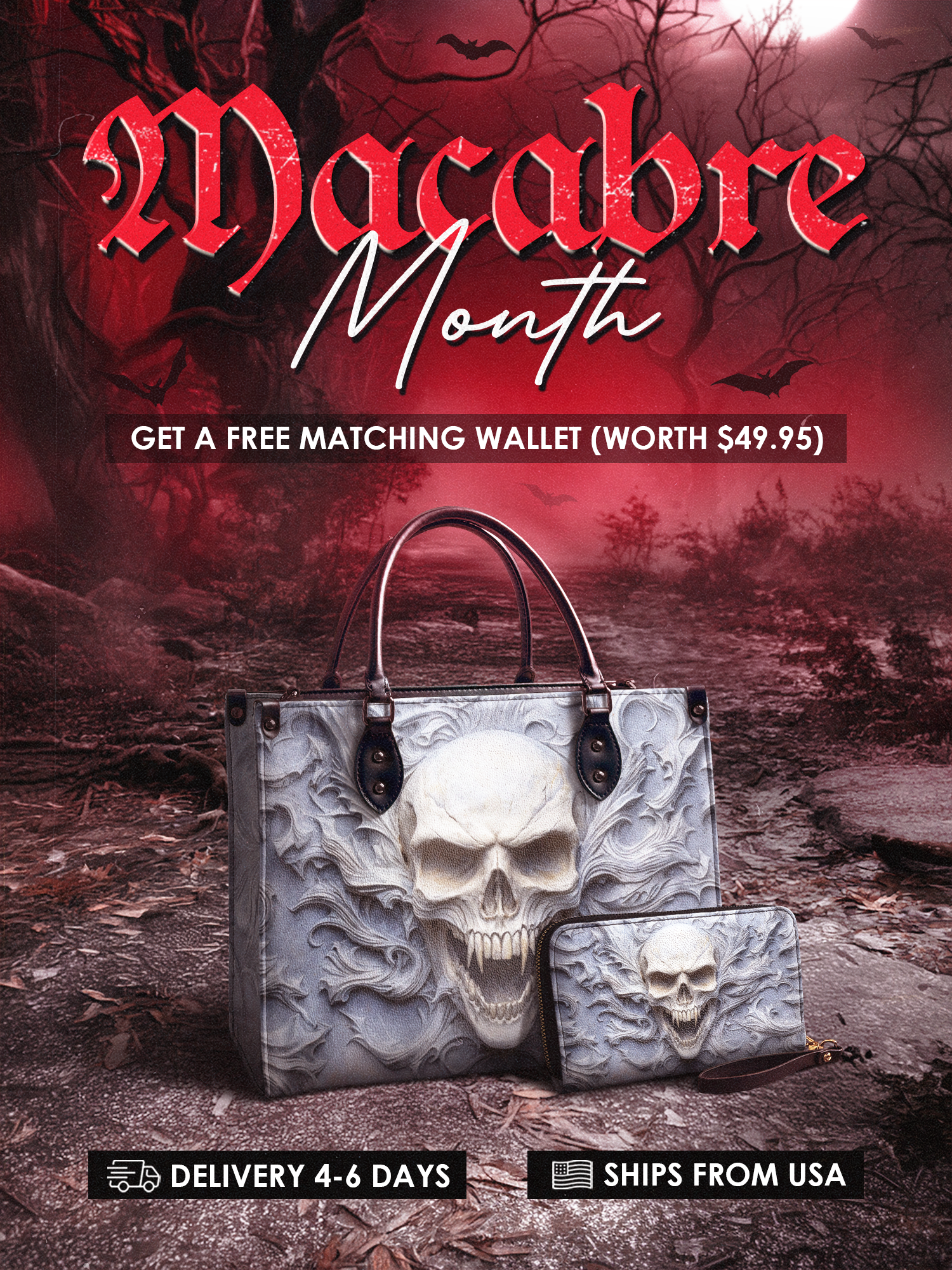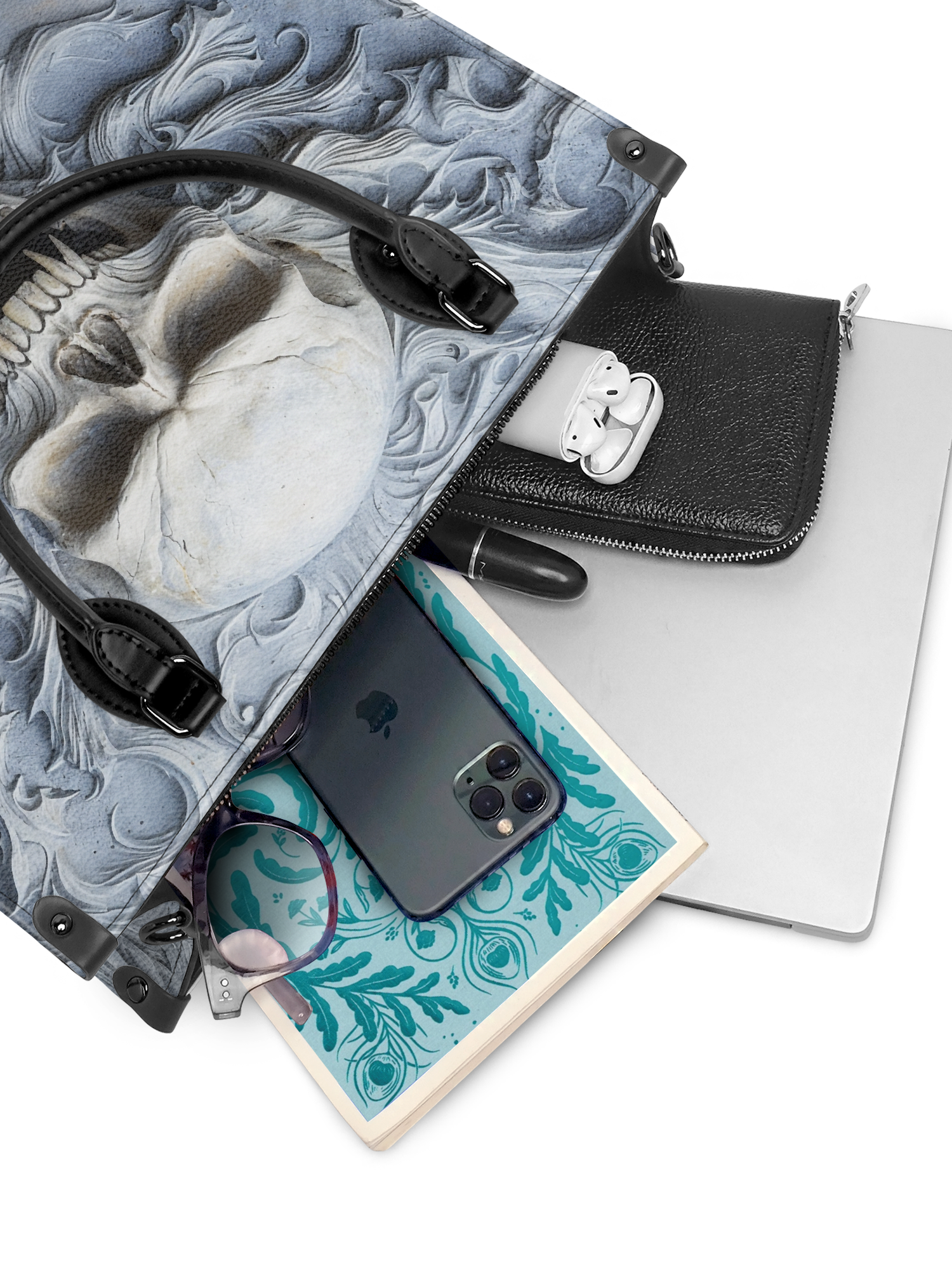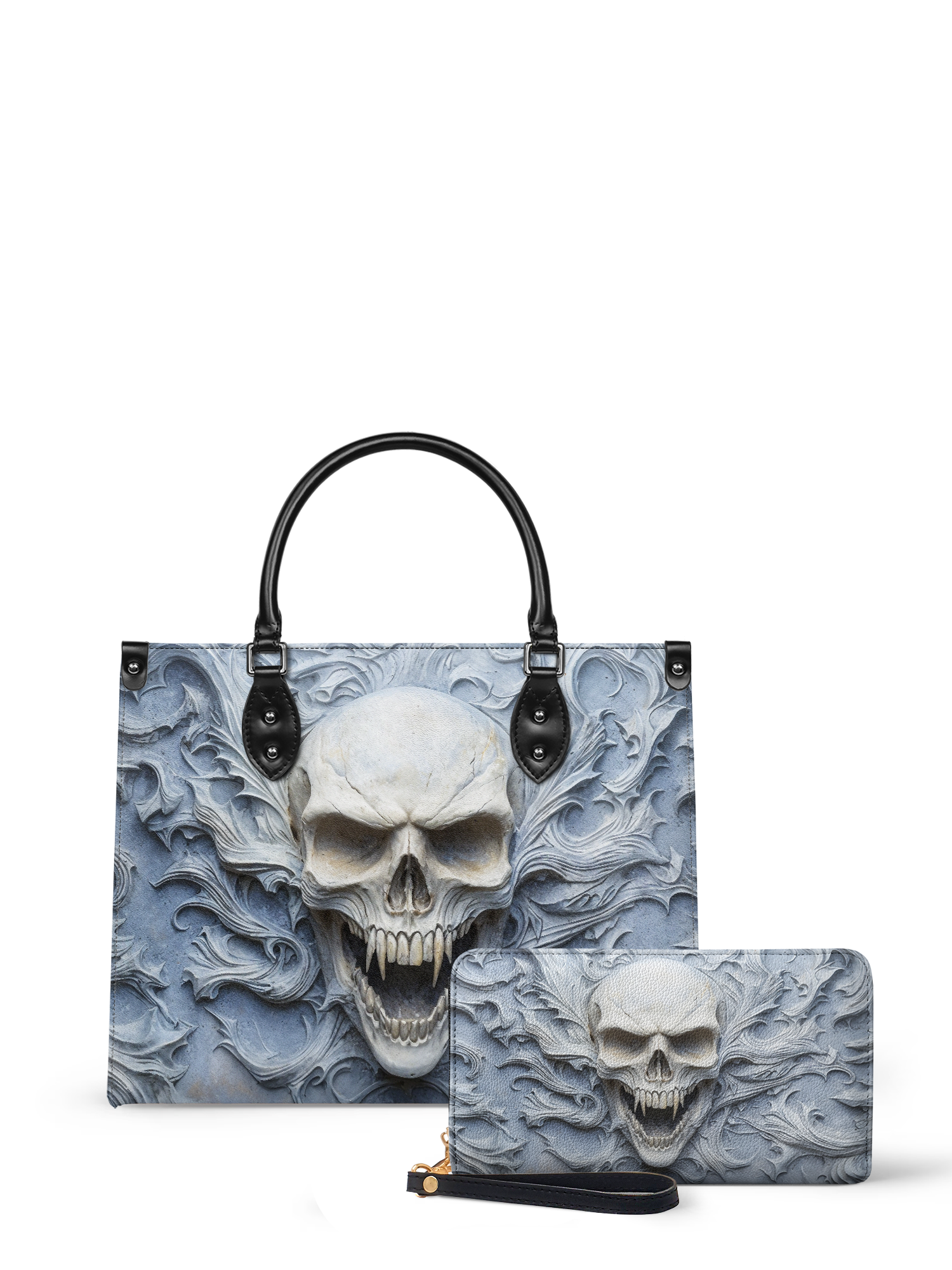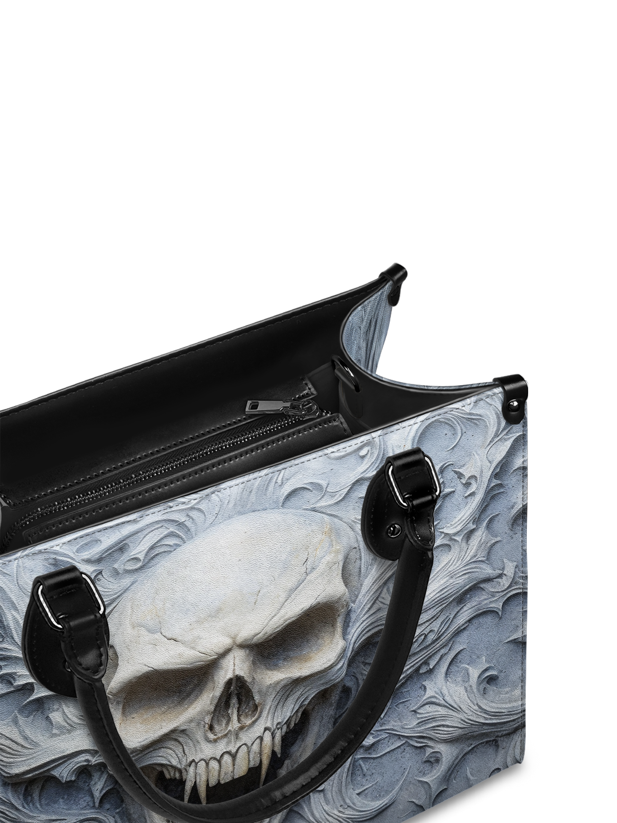 The Wraithbone leather handbag is where Gothic horror meets high fashion. Sculpted in icy tones of bone-white and steel-gray, the design features a snarling skull that seems to emerge from swirling stonework—like a cursed relic come to life. Crafted from durable vegan leather with sleek black handles and antique gold hardware, this handbag is made for those who wear darkness like armor. It’s not just a bag—it’s a bold declaration for those unafraid to bare their fangs.