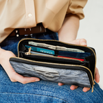 This wallet is spacious and stylish, holding beauty essentials, cash, cards, and a phone with ease.